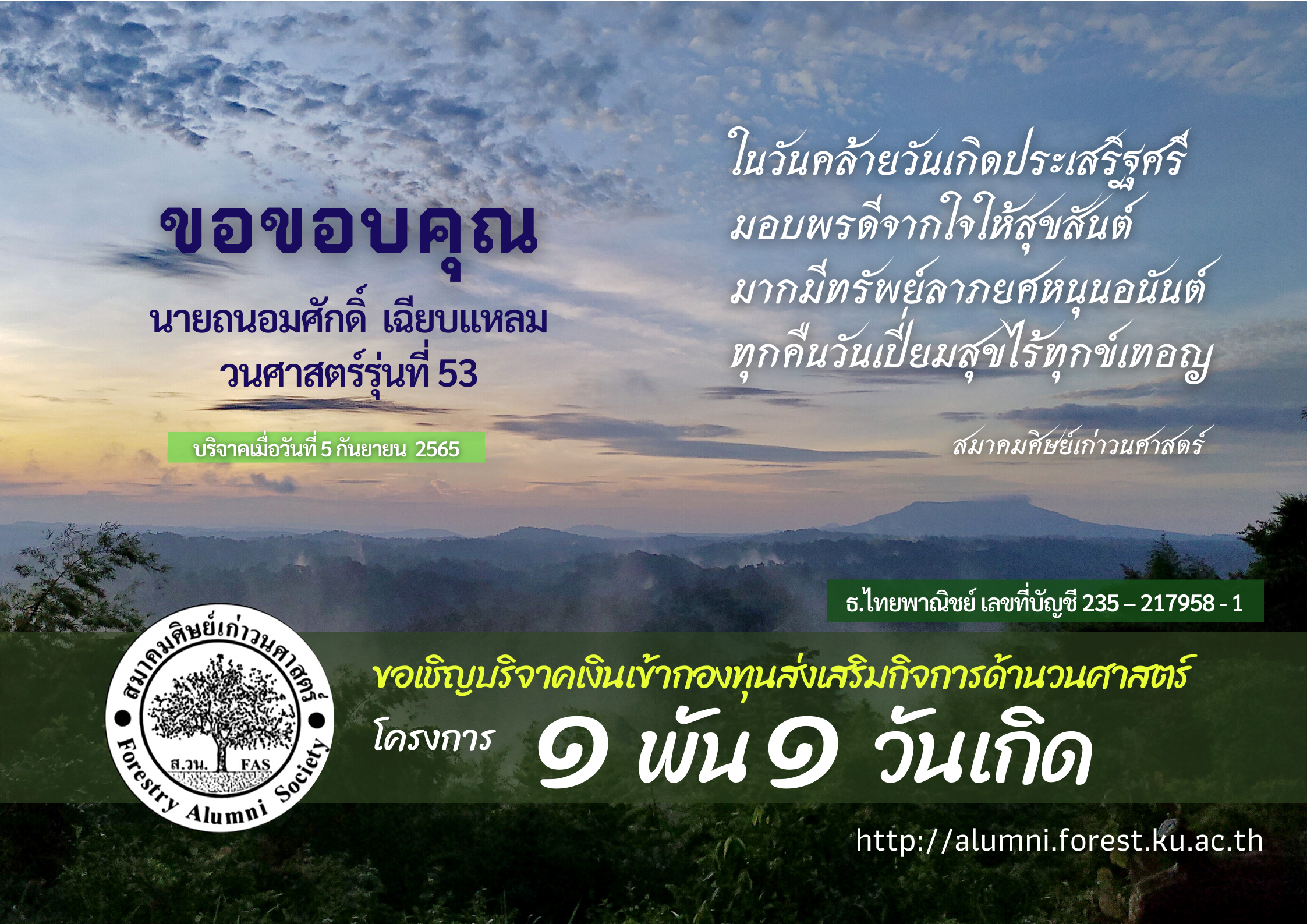 ขอขอบคุณ นายถนอมศักดิ์ เฉียบแหลม วน.53 สำหรับการสนับสนุนบริจาคเงินเข้ากองทุนส่งเสริมกิจการด้านวนศาสตร์ โครงการ 1 พันบาท 1 วันเกิดประจำเดือนกันยานย 2565 (บริจาคเมื่อวันที่ 5 กันยายน 2565)